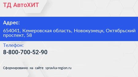 ТД АвтоХИТ по адресу 654041, Кемеровская область, Новокузнецк, Октябрьский проспект, 58 в дальнейшем Организация, размещена в следующих категориях: