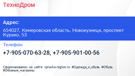 ТехноДром по адресу 654027, Кемеровская область, Новокузнецк, проспект Курако, 53 в дальнейшем Организация, размещена в следующих категориях:
