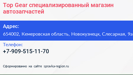 Top Gear, специализированный магазин автозапчастей по адресу 654002, Кемеровская область, Новокузнецк, Слесарная, 9а в дальнейшем Организация, размещена в следующих категориях: