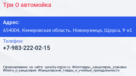 Три-О, автомойка по адресу 654004, Кемеровская область, Новокузнецк, Щорса, 9 к1 в дальнейшем Организация, размещена в следующих категориях: