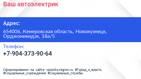 Ваш автоэлектрик по адресу 654006, Кемеровская область, Новокузнецк, Орджоникидзе, 18а/5 в дальнейшем Организация, размещена в следующих категориях: