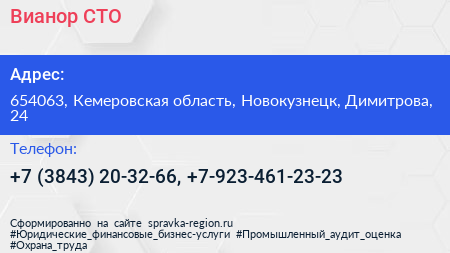 Вианор, СТО по адресу 654063, Кемеровская область, Новокузнецк, Димитрова, 24 в дальнейшем Организация, размещена в следующих категориях: