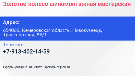 Золотое колесо, шиномонтажная мастерская по адресу 654066, Кемеровская область, Новокузнецк, Транспортная, 89/1 в дальнейшем Организация, размещена в следующих категориях: