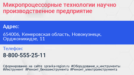 Микропроцессорные технологии, научно-производственное предприятие по адресу 654006, Кемеровская область, Новокузнецк, Орджоникидзе, 11 в дальнейшем Организация, размещена в следующих категориях: