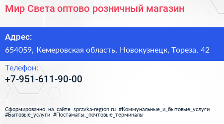 Мир Света, оптово-розничный магазин по адресу 654059, Кемеровская область, Новокузнецк, Тореза, 42 в дальнейшем Организация, размещена в следующих категориях: