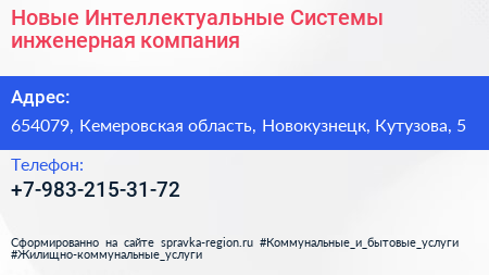 Новые Интеллектуальные Системы, инженерная компания по адресу 654079, Кемеровская область, Новокузнецк, Кутузова, 5 в дальнейшем Организация, размещена в следующих категориях: