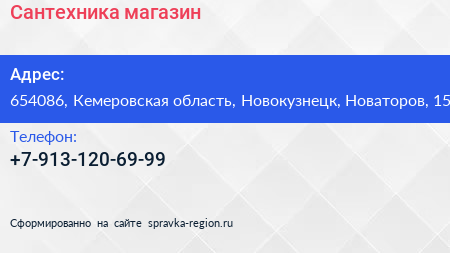Сантехника, магазин по адресу 654086, Кемеровская область, Новокузнецк, Новаторов, 15 в дальнейшем Организация, размещена в следующих категориях: