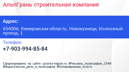 АльпГрань, строительная компания по адресу 654006, Кемеровская область, Новокузнецк, Колхозный проезд, 1 в дальнейшем Организация, размещена в следующих категориях: