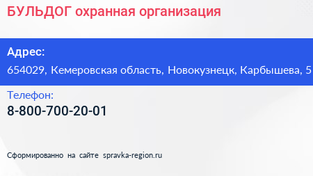 БУЛЬДОГ, охранная организация по адресу 654029, Кемеровская область, Новокузнецк, Карбышева, 5 в дальнейшем Организация, размещена в следующих категориях: