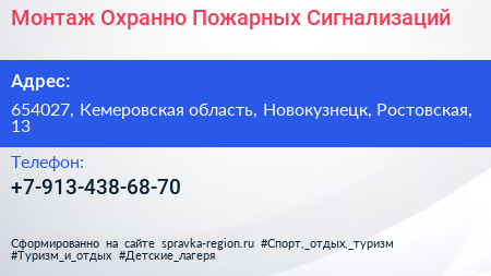 Монтаж Охранно-Пожарных Сигнализаций по адресу 654027, Кемеровская область, Новокузнецк, Ростовская, 13 в дальнейшем Организация, размещена в следующих категориях:
