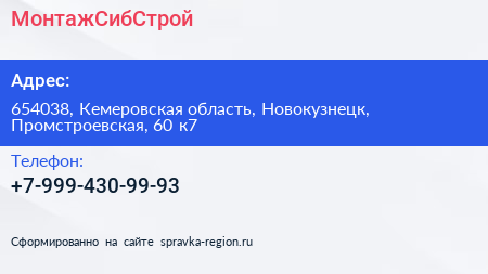МонтажСибСтрой по адресу 654038, Кемеровская область, Новокузнецк, Промстроевская, 60 к7 в дальнейшем Организация, размещена в следующих категориях: