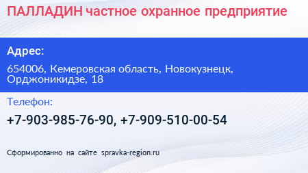 ПАЛЛАДИН, частное охранное предприятие по адресу 654006, Кемеровская область, Новокузнецк, Орджоникидзе, 18 в дальнейшем Организация, размещена в следующих категориях: