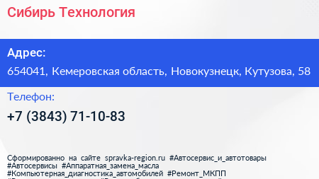 Сибирь-Технология по адресу 654041, Кемеровская область, Новокузнецк, Кутузова, 58 в дальнейшем Организация, размещена в следующих категориях: