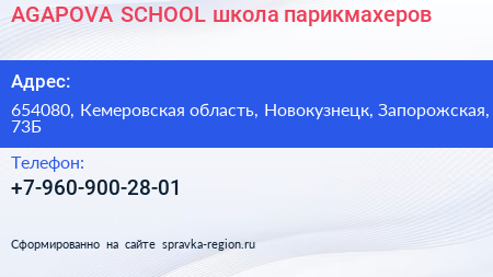 AGAPOVA SCHOOL, школа парикмахеров по адресу 654080, Кемеровская область, Новокузнецк, Запорожская, 73Б в дальнейшем Организация, размещена в следующих категориях: