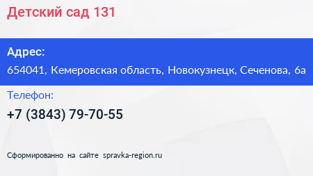 Детский сад №131 по адресу 654041, Кемеровская область, Новокузнецк, Сеченова, 6а в дальнейшем Организация, размещена в следующих категориях: