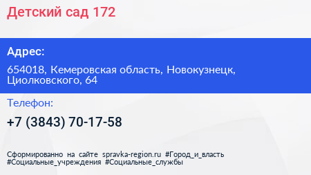 Детский сад №172 по адресу 654018, Кемеровская область, Новокузнецк, Циолковского, 64 в дальнейшем Организация, размещена в следующих категориях: