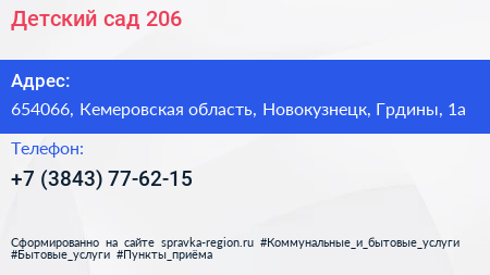 Детский сад №206 по адресу 654066, Кемеровская область, Новокузнецк, Грдины, 1а в дальнейшем Организация, размещена в следующих категориях: