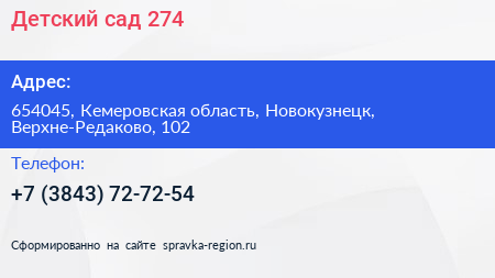 Детский сад №274 по адресу 654045, Кемеровская область, Новокузнецк, Верхне-Редаково, 102 в дальнейшем Организация, размещена в следующих категориях: