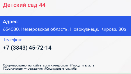 Детский сад №44 по адресу 654080, Кемеровская область, Новокузнецк, Кирова, 80а в дальнейшем Организация, размещена в следующих категориях: