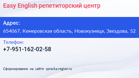Easy English, репетиторский центр по адресу 654067, Кемеровская область, Новокузнецк, Звездова, 52 в дальнейшем Организация, размещена в следующих категориях: