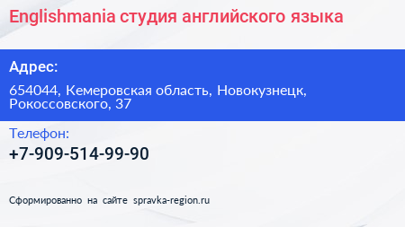 Englishmania, студия английского языка по адресу 654044, Кемеровская область, Новокузнецк, Рокоссовского, 37 в дальнейшем Организация, размещена в следующих категориях: