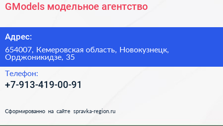GModels, модельное агентство по адресу 654007, Кемеровская область, Новокузнецк, Орджоникидзе, 35 в дальнейшем Организация, размещена в следующих категориях: