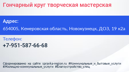 Гончарный круг, творческая мастерская по адресу 654005, Кемеровская область, Новокузнецк, ДОЗ, 19 к2а в дальнейшем Организация, размещена в следующих категориях: