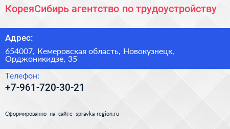 КореяСибирь, агентство по трудоустройству по адресу 654007, Кемеровская область, Новокузнецк, Орджоникидзе, 35 в дальнейшем Организация, размещена в следующих категориях:
