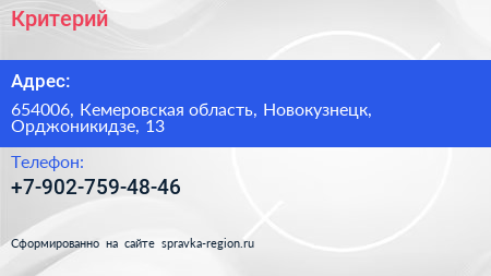 Критерий по адресу 654006, Кемеровская область, Новокузнецк, Орджоникидзе, 13 в дальнейшем Организация, размещена в следующих категориях:
