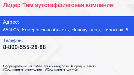 Лидер Тим, аутстаффинговая компания по адресу 654006, Кемеровская область, Новокузнецк, Пирогова, 9 в дальнейшем Организация, размещена в следующих категориях:
