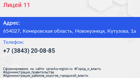 Лицей №11 по адресу 654027, Кемеровская область, Новокузнецк, Кутузова, 1а в дальнейшем Организация, размещена в следующих категориях: