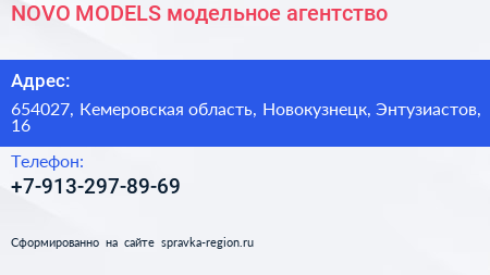 NOVO MODELS, модельное агентство по адресу 654027, Кемеровская область, Новокузнецк, Энтузиастов, 16 в дальнейшем Организация, размещена в следующих категориях: