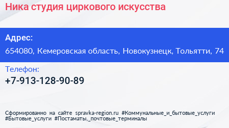 Ника, студия циркового искусства по адресу 654080, Кемеровская область, Новокузнецк, Тольятти, 74 в дальнейшем Организация, размещена в следующих категориях: