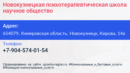 Новокузнецкая психотерапевтическая школа, научное общество по адресу 654079, Кемеровская область, Новокузнецк, Кирова, 14а в дальнейшем Организация, размещена в следующих категориях: