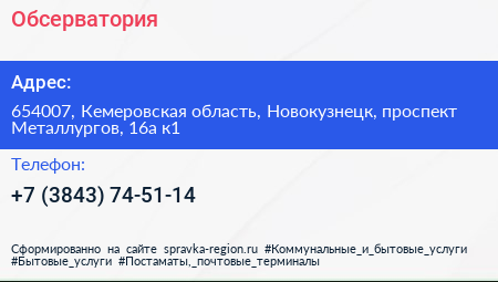Обсерватория по адресу 654007, Кемеровская область, Новокузнецк, проспект Металлургов, 16а к1 в дальнейшем Организация, размещена в следующих категориях: