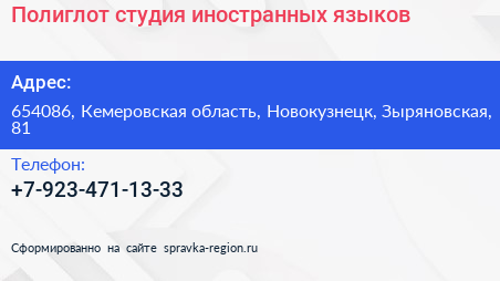 Полиглот, студия иностранных языков по адресу 654086, Кемеровская область, Новокузнецк, Зыряновская, 81 в дальнейшем Организация, размещена в следующих категориях: