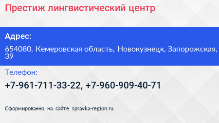 Престиж, лингвистический центр по адресу 654080, Кемеровская область, Новокузнецк, Запорожская, 39 в дальнейшем Организация, размещена в следующих категориях: