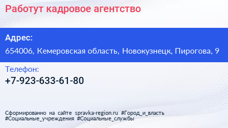 Работут, кадровое агентство по адресу 654006, Кемеровская область, Новокузнецк, Пирогова, 9 в дальнейшем Организация, размещена в следующих категориях: