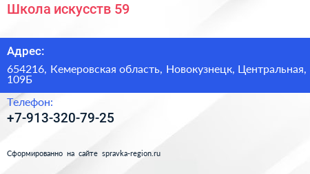 Школа искусств №59 по адресу 654216, Кемеровская область, Новокузнецк, Центральная, 109Б в дальнейшем Организация, размещена в следующих категориях: