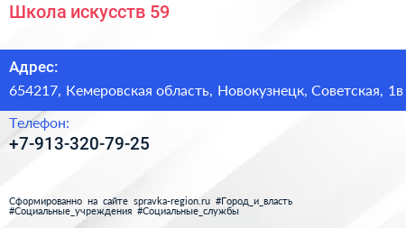 Школа искусств №59 по адресу 654217, Кемеровская область, Новокузнецк, Советская, 1в в дальнейшем Организация, размещена в следующих категориях: