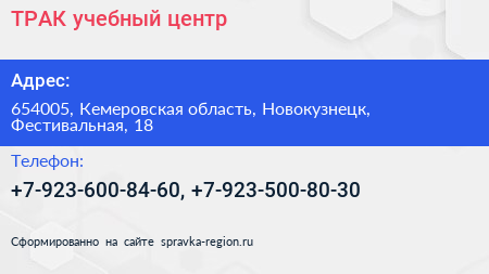 ТРАК, учебный центр по адресу 654005, Кемеровская область, Новокузнецк, Фестивальная, 18 в дальнейшем Организация, размещена в следующих категориях: