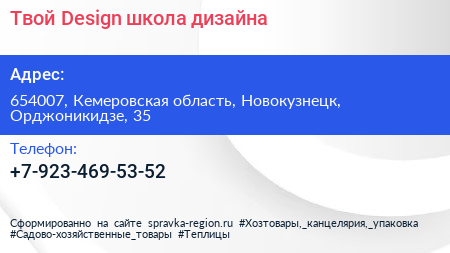 Твой Design, школа дизайна по адресу 654007, Кемеровская область, Новокузнецк, Орджоникидзе, 35 в дальнейшем Организация, размещена в следующих категориях: