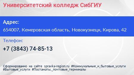 Университетский колледж, СибГИУ по адресу 654007, Кемеровская область, Новокузнецк, Кирова, 42 в дальнейшем Организация, размещена в следующих категориях: