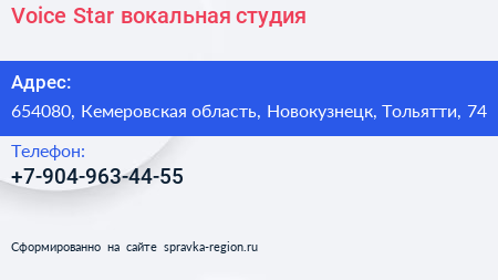 Voice Star, вокальная студия по адресу 654080, Кемеровская область, Новокузнецк, Тольятти, 74 в дальнейшем Организация, размещена в следующих категориях: