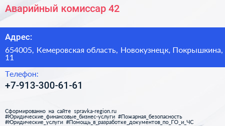 Аварийный комиссар 42 по адресу 654005, Кемеровская область, Новокузнецк, Покрышкина, 11 в дальнейшем Организация, размещена в следующих категориях:
