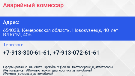 Аварийный комиссар по адресу 654038, Кемеровская область, Новокузнецк, 40 лет ВЛКСМ, 40Б в дальнейшем Организация, размещена в следующих категориях: