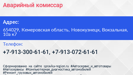 Аварийный комиссар по адресу 654029, Кемеровская область, Новокузнецк, Вокзальная, 10а к7 в дальнейшем Организация, размещена в следующих категориях: