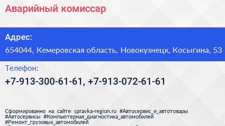 Аварийный комиссар по адресу 654044, Кемеровская область, Новокузнецк, Косыгина, 53 в дальнейшем Организация, размещена в следующих категориях: