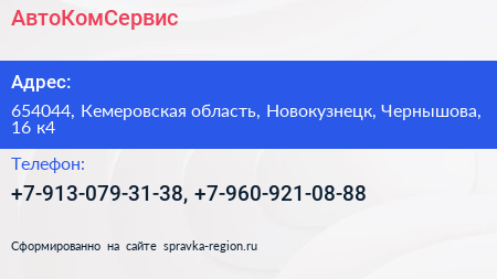 АвтоКомСервис по адресу 654044, Кемеровская область, Новокузнецк, Чернышова, 16 к4 в дальнейшем Организация, размещена в следующих категориях: