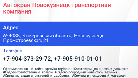 Автокран Новокузнецк, транспортная компания по адресу 654038, Кемеровская область, Новокузнецк, Промстроевская, 21 в дальнейшем Организация, размещена в следующих категориях: